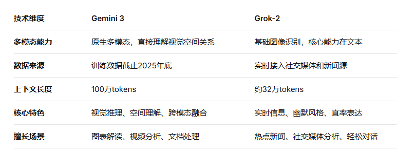 Gemini 3与Grok-2是两款定位完全不同的产品:Gemini 3是“视觉专家+文档处理能手”,Grok-2是“实时播报员+幽默段子手”。没有绝对的优劣,只有场景的适配。