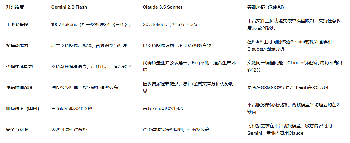 基于RskAi平台的实测环境,我们从开发者最关注的六个技术维度对Gemini 2.0 Flash和Claude 3.5 Sonnet进行了对比测试。