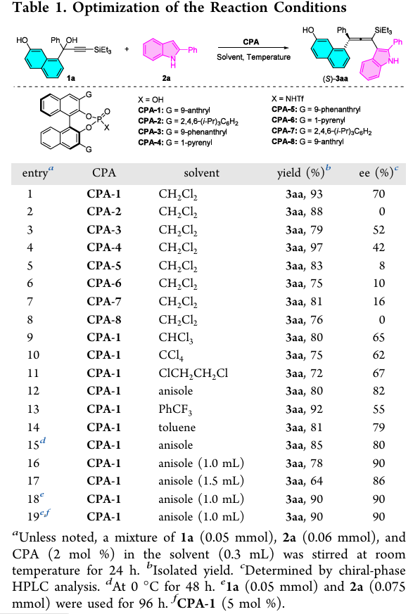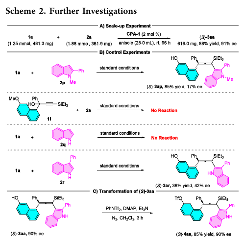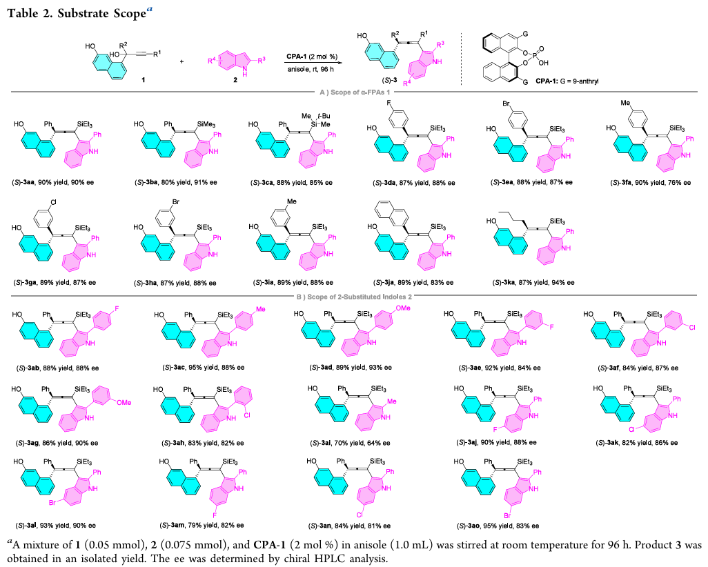 CPA同时活化缺电子共轭体系和2-芳基吲哚亲核试剂,实现对映选择性控制;