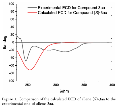 整体反应产物产率范围70~95%,对映选择性64~94% ee,轴手性四取代联烯的绝对构型通过电子圆二色谱(ECD)确定为S型,其他产物构型通过类比推定。