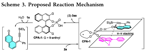 α-(2-羟基萘-8-基)炔丙醇在CPA催化下发生脱水反应,原位生成炔基-8-亚甲基萘-2(8H)-酮(缺电子共轭体系);