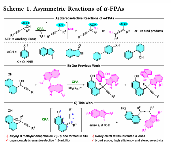 炔丙醇是合成化学中多功能的构建模块,可通过手性磷酸(CPA)催化α-官能化炔丙醇(α-FPAs)脱水,原位生成缺电子受体并实现不对称加成。β-萘酚作为重要合成骨架,可作为辅助基团引入α-FPAs,此前研究中α-(2-羟基萘-8-基)炔丙醇能在CPA催化下原位生成炔基-8-亚甲基萘-2(8H)-酮并发生1,6-加成,但炔基官能团的反应潜力尚未充分开发。