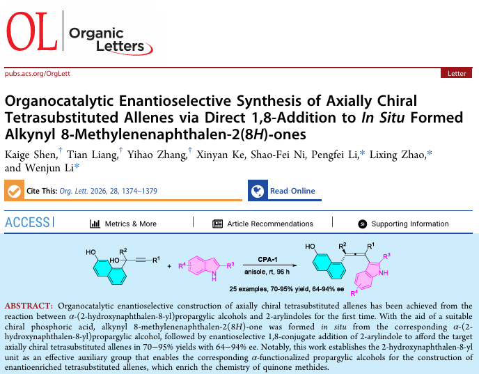 本研究首次实现了α-(2-羟基萘-8-基)炔丙醇与2-芳基吲哚的有机催化对映选择性反应,在合适的手性磷酸(CPA-1)催化下,通过原位生成炔基-8-亚甲基萘-2(8H)-酮,经不对称1,8-共轭加成高效合成一系列轴手性四取代联烯,产物分离产率70~95%,对映选择性64~94% ee。该研究确立了2-羟基萘-8-基作为高效辅助基团的应用价值,拓展了醌甲基化物的化学研究范畴,同时首次实现了炔基-8-亚甲基萘-2(8H)-酮的不对称1,8-加成反应,为轴手性四取代联烯的合成提供了新的实用路径。