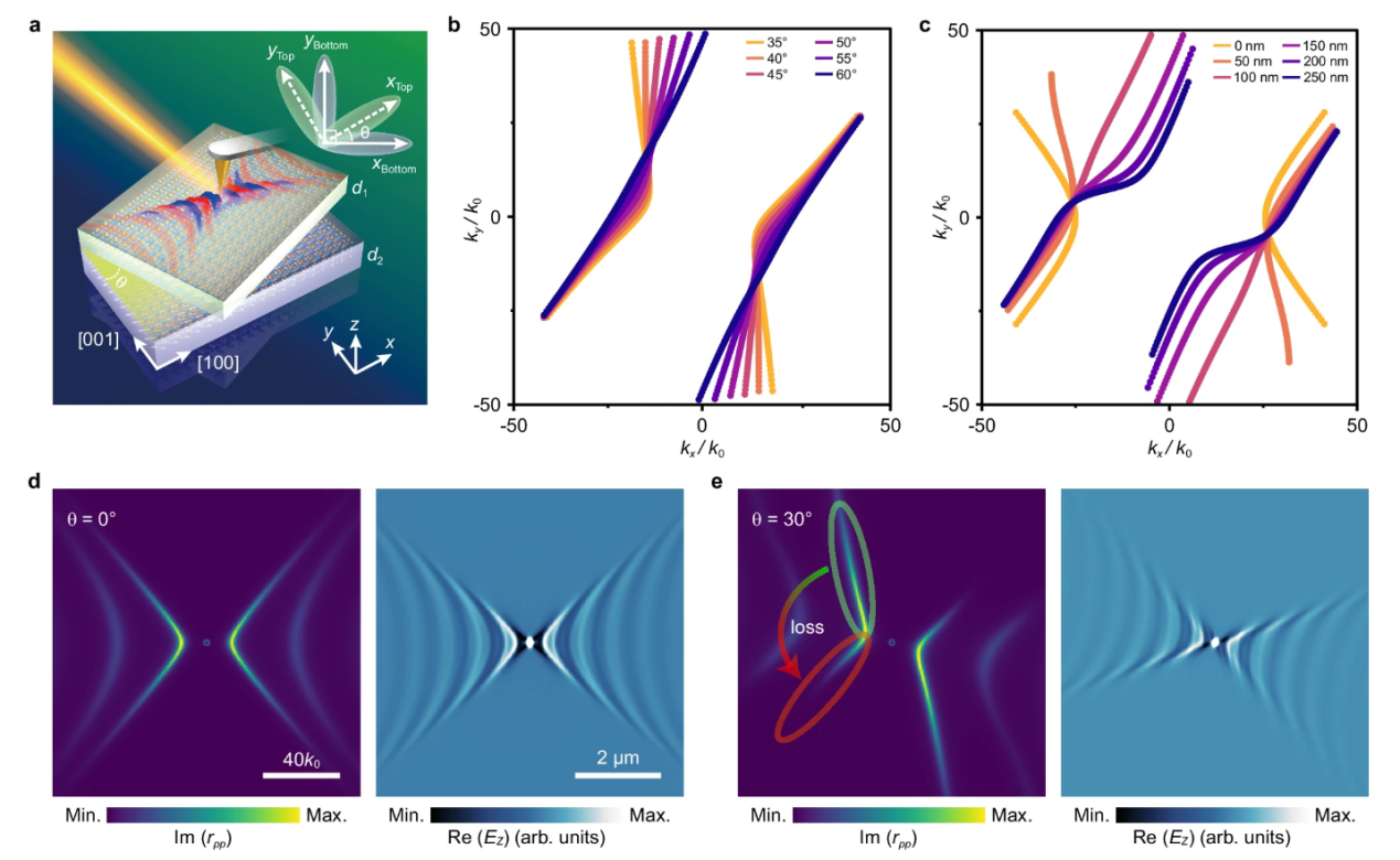 通过二维材料扭转和异质结集成,本实验首次在非单斜晶系材料中实现HShPs的可控激发与动态重构,突破了传统体材料的局限性。该平台实现了HShPs的多维调控(静态+动态),为片上极化激元器件(如光学开关、调制器)和亚衍射成像提供了新思路。