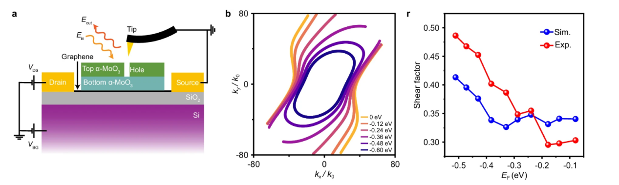 文章通过机械剥离法制备α-MoO3薄层,精确控制上下层厚度(d1,d2)和扭转角度(θ);制备双层α-MoO3/石墨烯异质结器件,通过背栅电压调控石墨烯的费米能级(E_F);如图1(a)所示,使用红外近场光学显微镜在931cm-1光波频率下激发HShPs,观测其非对称传播和场分布,利用傅里叶变换分析提取动量空间中的等频线(IFCs)、量化剪切因子(Shear factor)和品质因子(Q),通过改变栅压(V_g)调节石墨烯的费米能级,动态改变HShPs的传播方向和拓扑特性。