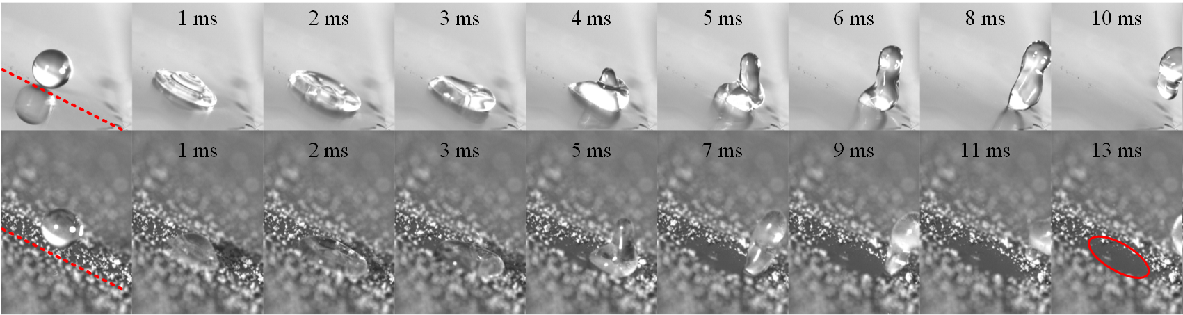 实验内容:对超疏水传感器表面施加电压使其充电,利用静电力吸附周围灰尘,形成均匀积灰层,模拟超疏水器件长期使用后的表面积灰状态。再通过液滴滴落在积灰表面,观察液滴的碰撞、铺展与弹跳,验证超疏水表面的自清洁能力。