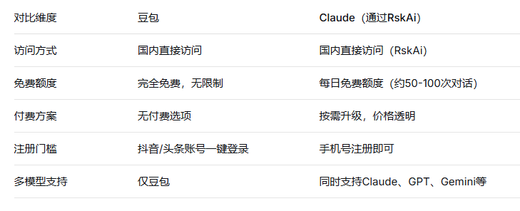 对于国内用户,最理想的方案是“两者兼得”:日常用豆包解决轻量问题,遇到专业任务时通过RskAi调用Claude。这种组合既能享受免费便利,又能获得顶级模型的深度能力,真正实现AI工具的价值最大化。