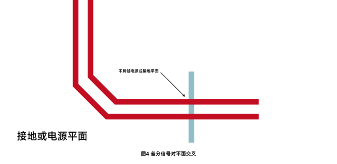 ▪ 信号走线禁止跨越平面分割(图4)。跨越分割会导致回流路径异常,影响信号质量并引发EMI