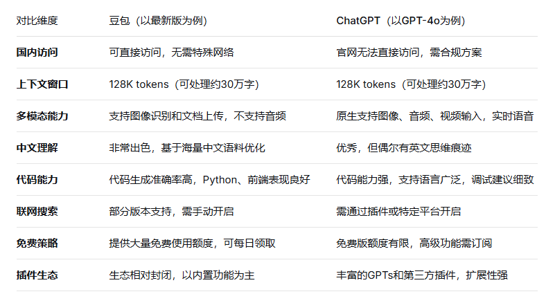 小结: 从表格可以看出,豆包在中文理解和国内访问便利性上占据明显优势,而ChatGPT在多模态能力和生态扩展性上更胜一筹。两者各有千秋,实际使用中可根据具体需求选择。