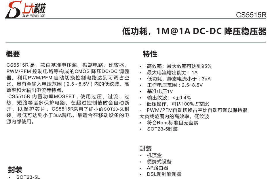 CS5503 属于上大科技低功耗降压 DC-DC 系列,定位小电流、低成本、高可靠性应用,采用紧凑封装设计,支持锂电常用输入电压,具备优秀的轻载效率与低静态电流特性,PWM/PFM 双模式自动切换,在不同负载下均能保持高效转换。芯片集成完善的保护功能,外围极简,适合小型便携产品、低功耗模块、电池供电手持设备等批量应用场景。