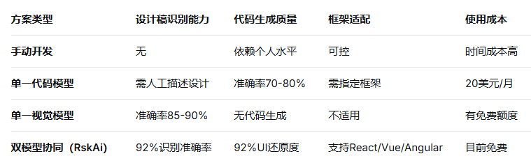 以RskAi为例,它聚合了Gemini 3 Pro(负责视觉解析)和ChatGPT-5.4(负责代码生成),开发者可以先让Gemini“看懂”设计稿并输出结构化描述,再让ChatGPT根据描述生成代码。这种协同模式在UI还原度、响应式适配、代码可维护性三个维度上均优于单一模型方案。
