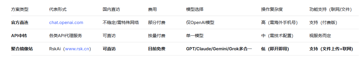 国内用户无需特殊网络环境,即可通过聚合镜像站RskAi(www.rsk.cn)免费使用包括ChatGPT(GPT系列)、Claude、Gemini和Grok在内的多款顶级AI模型。