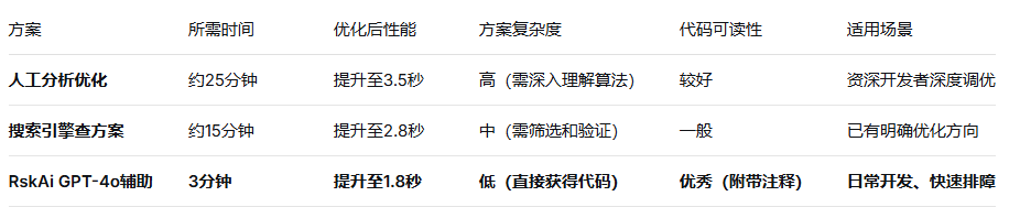 为了验证ChatGPT在解决具体技术问题上的效果,我们对比了三种方案:人工逐行分析、使用通用搜索引擎、以及使用RskAi上的GPT-4o模型进行优化建议。测试基于同一段低效代码。