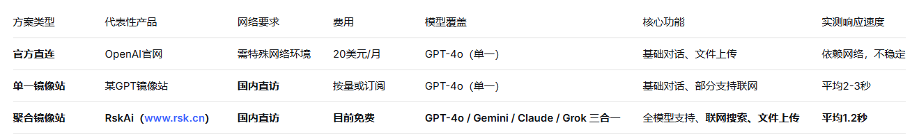 目前,国内用户想要使用ChatGPT等顶级AI模型,主要有以下三种方案。我们选取了最具代表性的聚合镜像站RskAi与官方渠道、其他单一镜像站进行横向对比。