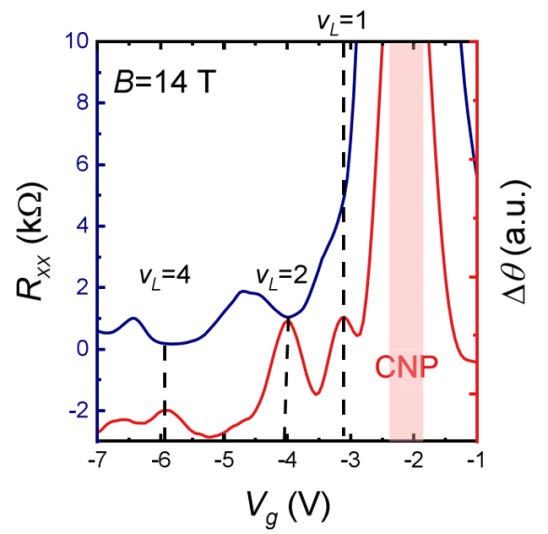图3. 在B=14T时,CNP附近测得的声表面波相移和经度电阻的比较