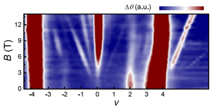 图4. 通过声表面波传输的电压的归一化相位与摩尔填充因子和垂直磁场的函数关系