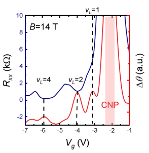 图1. B = 14 T 时 CNP 附近测得的声表面波相移和经度电阻的比较