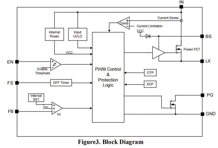 在面对更为极端的输出死短路工况时,芯片不仅配备了逐周期峰值电流限制(Cycle-by-cycle Peak Current Limit)来防止电感发生磁饱和,更支持智能的打嗝模式(Hic-cup Mode)短路保护。一旦检测到持续短路,芯片会立刻停止高频开关并进入极低功耗的间歇重启状态,待故障移除后自动平滑恢复正常输出,极大提升了整套系统的抗毁伤能力。