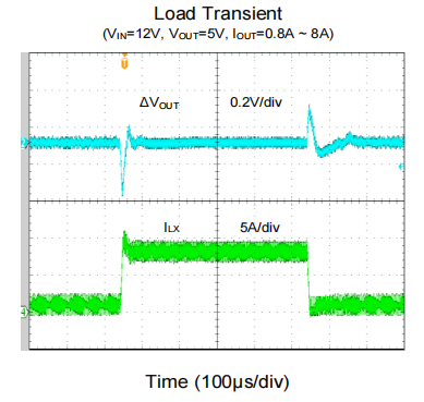 图四:极速响应,8A 大负载瞬态跳变下的输出电压实测波形