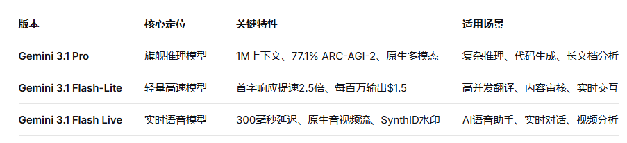 Gemini 3.1并非单一模型,而是针对不同场景优化的三个版本:
