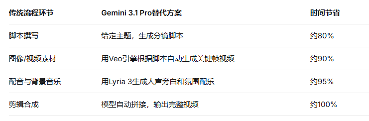 Gemini 3.1 Pro的多模态引擎(Veo、Lyria 3)与可配置思考深度,为两类用户提供了显著的效率提升: