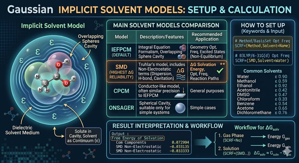 Gaussian中溶剂模型的使用非常简洁,通过一行SCRF关键字即可实现大多数计算需求。在众多模型中,SMD因同时考虑电静与非电静贡献,已成为当前计算溶剂化自由能的首选方案。对于结构优化与反应路径研究,IEFPCM与SMD均可胜任。合理选择模型并结合计算目标,是获得可靠溶剂效应结果的关键。