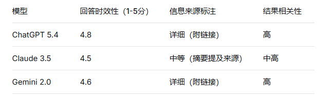 联网搜索是大模型从“知识库”迈向“实时工具”的关键功能。实测表明,ChatGPT 5.4、Claude 3.5、Gemini 2.0均具备可靠的联网能力,其中ChatGPT 5.4在多轮整合和响应速度上略占优势,Claude 3.5在信息摘要的规范性上表现良好,Gemini 2.0的数据来源标注较为清晰。
