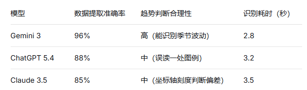 结论:对于需要从图表、截图、扫描件中提取结构化数据的任务,Gemini 3是目前较为可靠的选择。