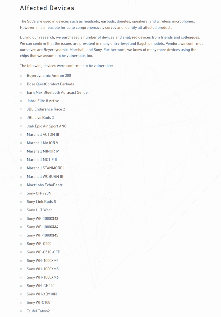 ERNW 发布的报告显示,此次的安全漏洞问题至少影响了知名品牌厂商出品的 29 款音频设备,其中不乏Sony、Marshall 等传统音频大厂。