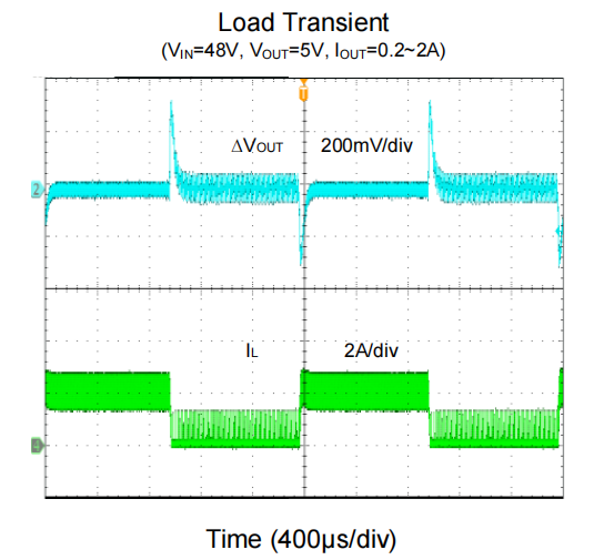 (3)有效抑制了输出电压的过冲与跌落,且外围无需复杂的RC补偿网络,极大降低了环路调试的复杂性。