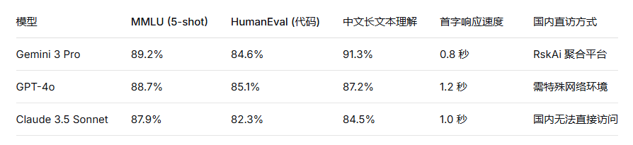 为直观评估 Gemini 3 Pro 的实际表现,下表基于公开基准(MMLU、HumanEval、BIG-bench)及国内镜像站实测数据(2026 年 3 月):