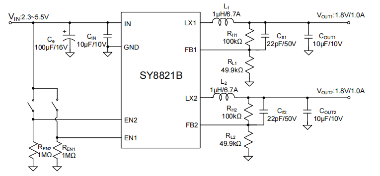 传统双路供电方案最让硬件团队头疼的,就是密密麻麻的外围电感、二极管与补偿网络,这会让板卡布线变得异常艰难。SY8821B 原生支持 2.3V 到 5.5V 的宽泛输入电压,完美覆盖了标准的 3.3V 和 5V 前端总线,且完全摒弃了外部续流二极管。