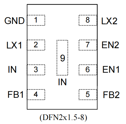 SY8821B 展现了极高的晶圆级集成造诣。它采用了极其微缩的 DFN2x2-8 封装,在仅有 4 平方毫米的物理面积上,巧妙地布置了两组完全独立的开关节点与使能控制端。更核心的热力学设计在于,封装底部的超大面积裸露接地焊盘(Exposed Pad),为高频开关产生的热量提供了直通 PCB 地平面的散热高速公路,彻底化解了微型化带来的热淤积危机。