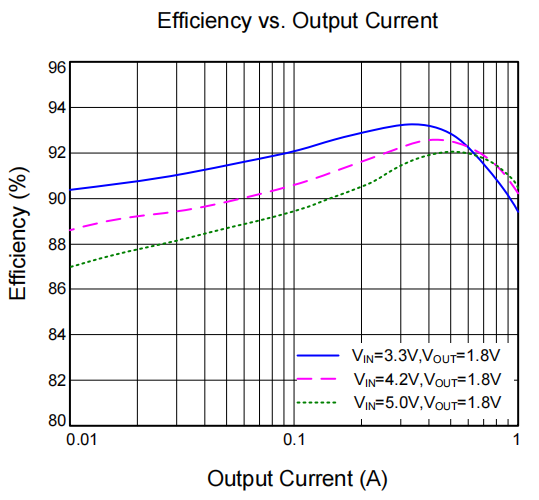 在便携式设备中,转换效率是决定整机续航的绝对关键。SY8821B 将内部开关管的导通电阻极力压缩至 180mΩ(高侧)和 120mΩ(低侧),有效削减了 1A 满载大电流下的导通损耗。
