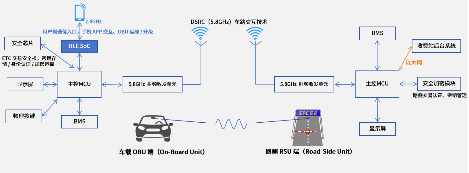 如下架构示意图所示,BLE SoC为OBU打开了一条面向用户侧的通信入口,使其能在日常使用环境中与智能手机APP进行持续的短距交互,可帮助用户在线完成设备激活/绑定、账户信息同步、无线OTA升级、交易记录查询与参数配置等流程。