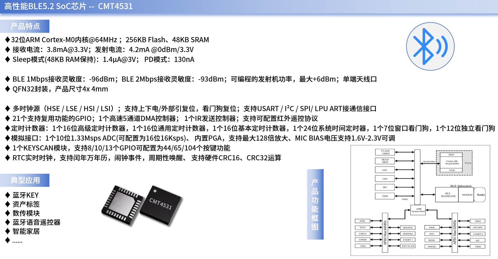 在无线性能与系统集成度方面,CMT4531支持最大+6 dBm发射功率,在车内复杂电磁环境下具备稳定的连接性能与抗干扰能力。