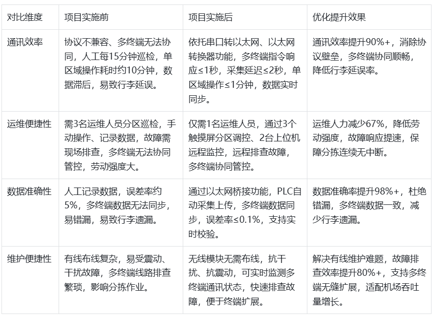 本次机场行李分拣升级项目,通过远创智控MPI-ETH-YC01-S模块,成功解决西门子300系列PLC与多个触摸屏、上位机的通讯难题,充分发挥串口转以太网、以太网转换器、以太网桥接器核心功能,实现多终端协同管控。项目实施后,通讯效率、数据准确性大幅提升,运维成本显著降低,有效降低行李延误率与遗漏率,提升机场运营效率与旅客体验,是机场行李分拣多终端通讯升级的经典案例。