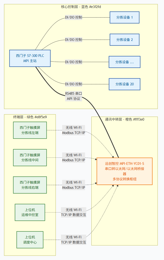 项目实施前,核心痛点集中在两点:一是协议不兼容导致通讯失效,西门子300系列PLC采用专属MPI协议(物理层为RS-485,默认传输速率187.5kbit/s),而多个触摸屏采用Modbus协议、多台上位机采用TCP/IP协议,三种设备协议不互通,形成“通讯孤岛”;二是多终端协同通讯无法实现,此前尝试直接连接设备,不仅触摸屏指令无法下发、上位机无法采集数据,且多个终端同时连接时会出现信号矛盾、数据错乱,只能依靠人工每15分钟巡检,手动记录设备状态,不仅增加运维工作量,还易出现分拣偏差、行李遗漏,行李延误率达3%以上,数据滞后无法支撑效率优化,同时有线布线复杂、易受震动干扰,故障频发,进一步加剧通讯难题。