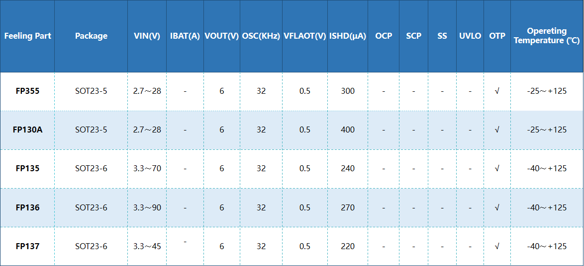 FP130A完整的高边电流检测电路,电阻调增益设定,2.7~28V耐压,SOT23-5L封装。FP355:2.7~24V耐压;FP135:3.3~70V耐压;FP136:3.3~90V耐压。