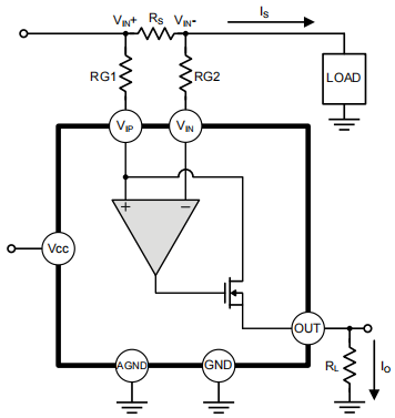 IS信号流经RS电阻然后流向负载,这种电流检测我们称之为高端点电流检测,采样电阻直接与地相连的我们称之为低端点电流检测。通过这点我们就可以知道,高端点电流检测可以有效的避免接地时危险的高电流。在此电路原理图中IS通过VIP和VIN的差分OPA正负输入,经过电阻RS会形成跨压,RS电阻具有调整倍率的作用,然后经过差分放大器与MOS管的放大作用,经过OUT脚输出,但是要注意的一点是,在OUT脚外部有一个RL电阻,这个电阻的作用把电流转换成电压输出。