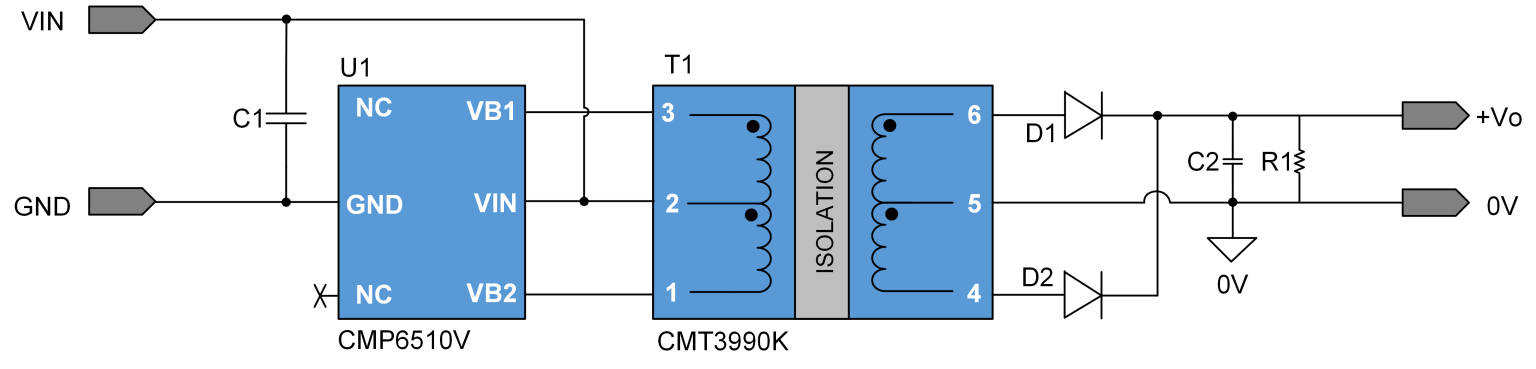CMP6510V+CMT3990K是深圳线易微电子推出的一款小型化的隔离电源方案。驱动器芯片和变压器配合必要的容阻和整流二极管,可以实现5V输入, 5V输出1W的隔离非稳压电源,SIP的引脚完全兼容金升阳B0505S-1WR3隔离电源模块。该方案可以实现非常紧凑的方案,PCB板占用面积小,适合隔离 485、隔离CAN、和隔离ADC供电,特别是空间限制大的场合。