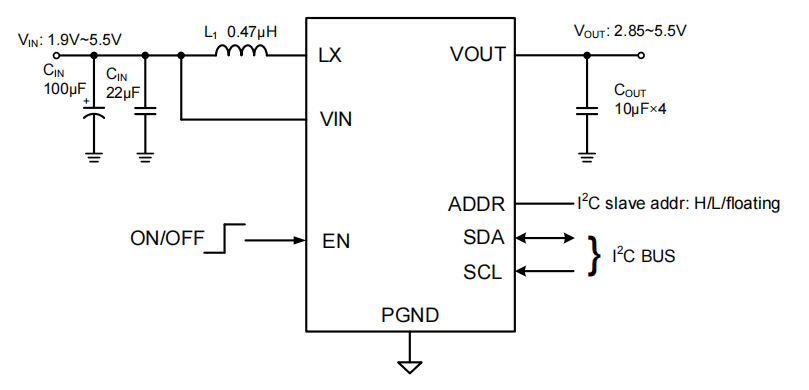 图注:外围极其简练,除了一颗 0.47µH 的小电感和几颗滤波电容,右下角的 I2C 总线(SDA/SCL)是它与系统主控对话的“神经末梢”。