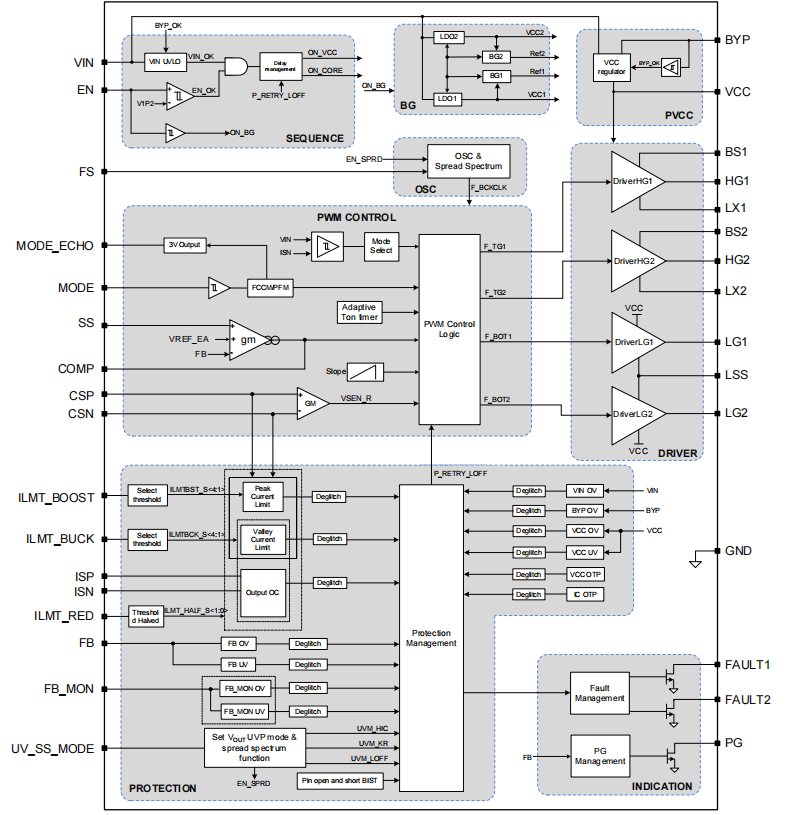 图注:多引脚封装内,清晰地引出了四个门极驱动引脚(TG1/BG1, TG2/BG2),这就是它指挥外部肌肉猛男的“缰绳”。