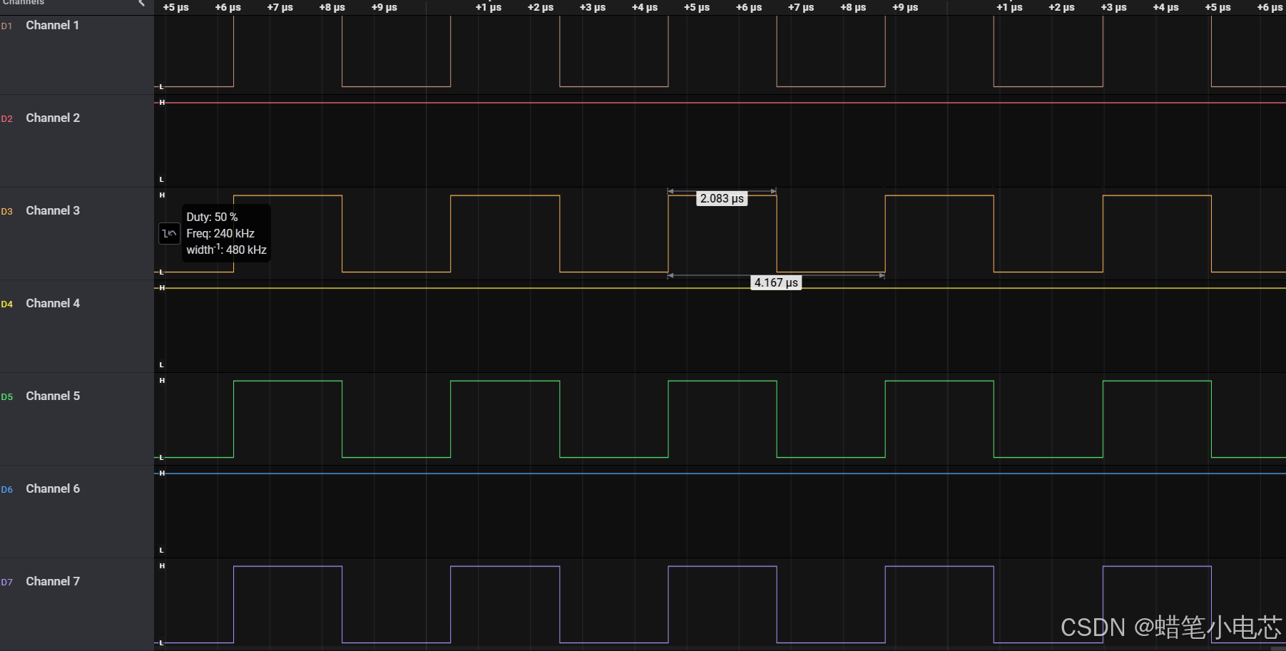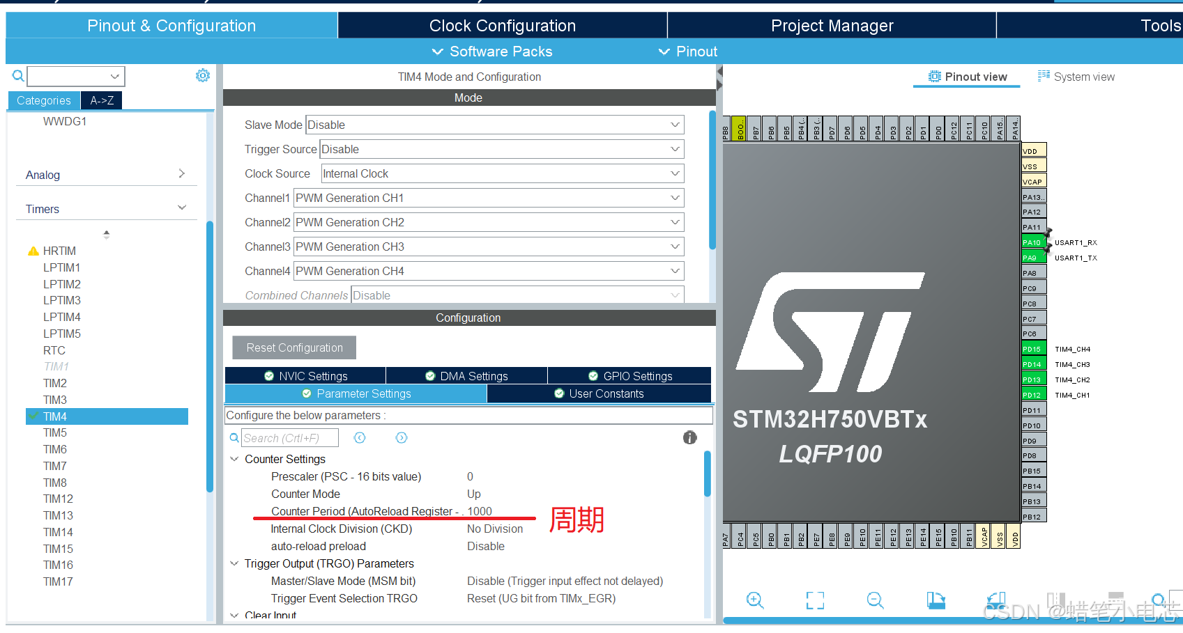 TIM4挂载在APB1下,不分频的情况下,实际PWM周期 = 设置的周期数值/定时器时钟;上图设置1000的实际周期为1000/240=4.1666(单位为us)。