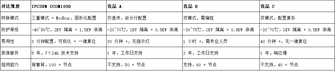 通过对比可以看出,IPCSUN CCOM100D在所有维度均优于同类CAN 转 RS232/485 转换器,尤其是三重转换模式、军工级防护、便捷易用性和 5 年质保,形成了显著差异化优势,更适合严苛工业现场使用。
