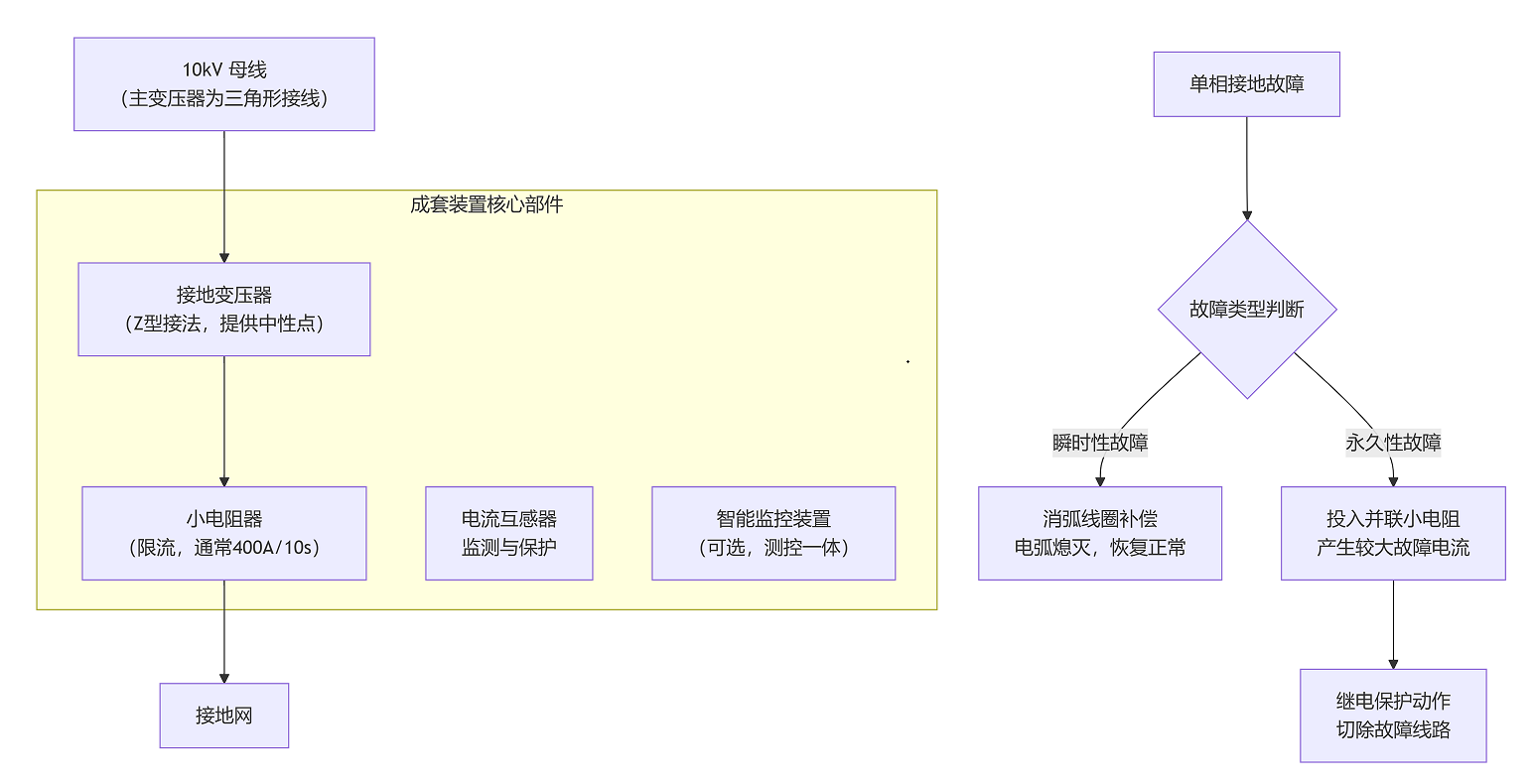 1.接地变压器:由于主变压器10kV侧多为三角形接线,没有可直接接地的中性点。接地变压器(通常为Z型接法)的作用就是人为创建一个系统中性点。