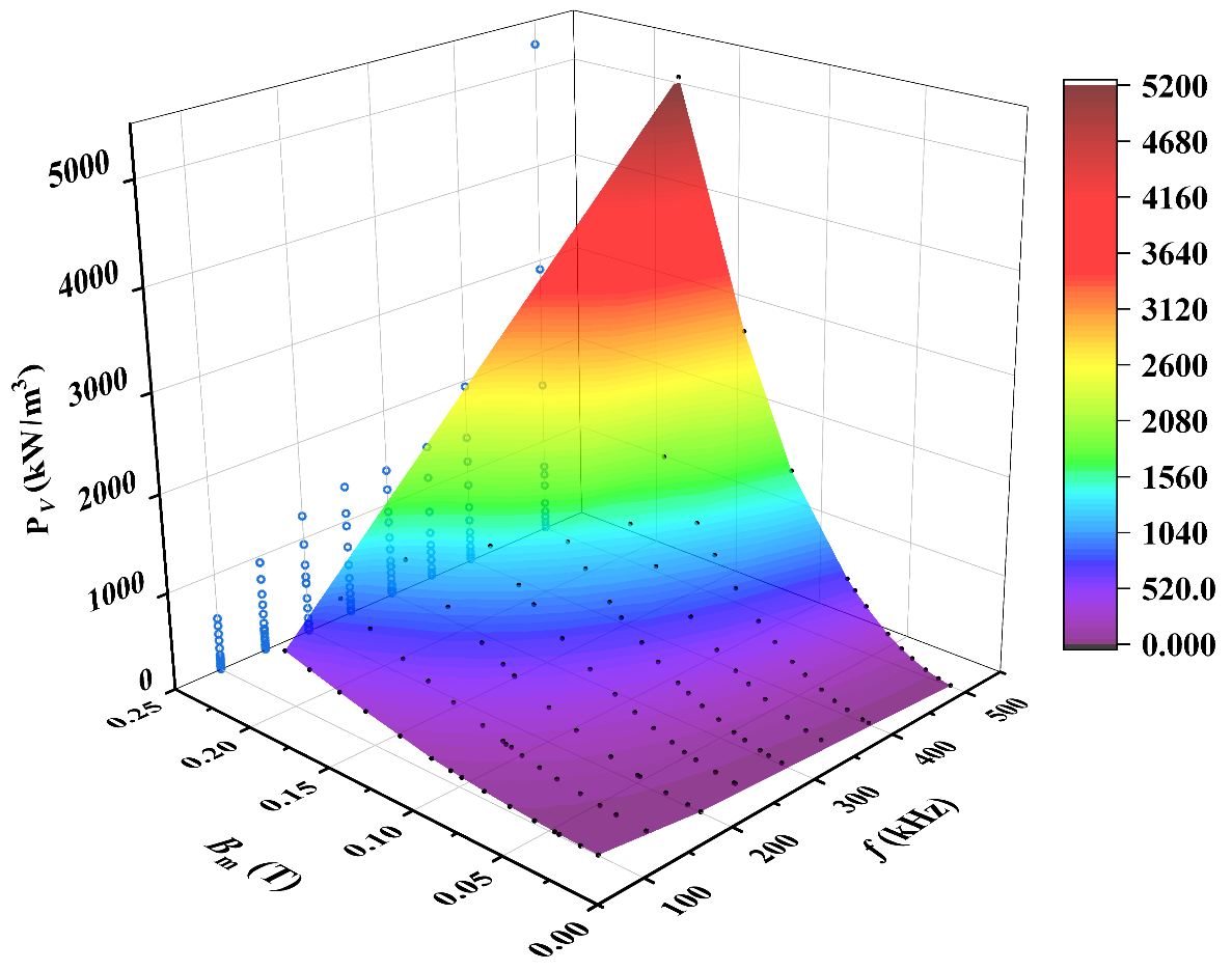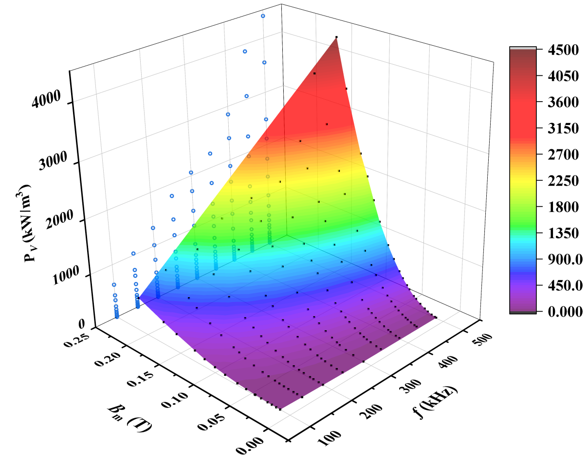根据双绕组法,2个电压探头检测环型磁芯的一次侧和二次侧电压,1个电流探头检测一次侧电流,将检测信号输入示波器。利用信号发生器产生所需频率、幅值、形状的波形,经功率放大器放大输入环型磁芯的一次侧。采集电压电流数据,换算为磁通密度和磁场强度,通过B-H曲线计算磁芯损耗。