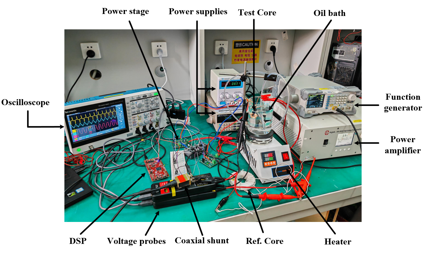 实验内容:测量频率在10kHz到500kHz范围内,磁通密度幅值在0~0.2T范围内,正弦波以及PWM波激励下的环型磁芯损耗,通过信号发生器产生所需波形,再利用功率放大器将信号输入磁芯的一次侧,利用双绕组法测量环型磁芯内部的磁芯损耗。