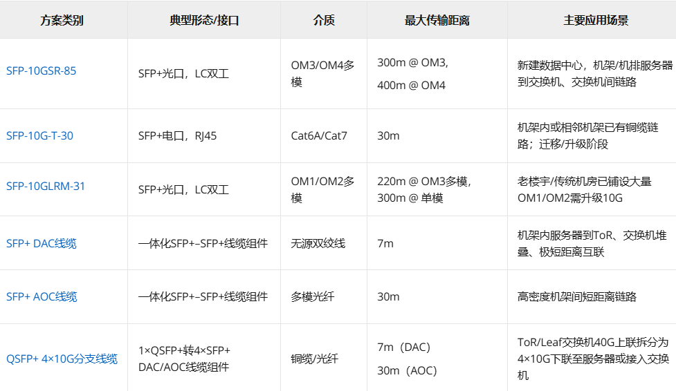 此时首选SFP-10G-SR。若为同机架极短链路,SFP+ DAC或AOC可进一步降低成本和功耗。