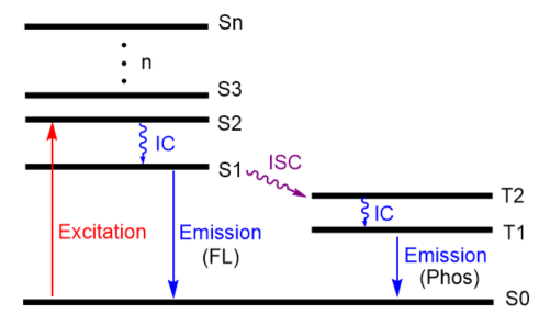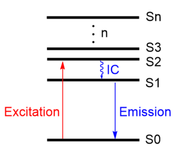 由于电子在激发态并不稳定,它会先通过非辐射跃迁的方式(如内转换 Internal Conversion,IC),迅速放出掉一部分能量后到第一激发态的最低振动能级(S1)。